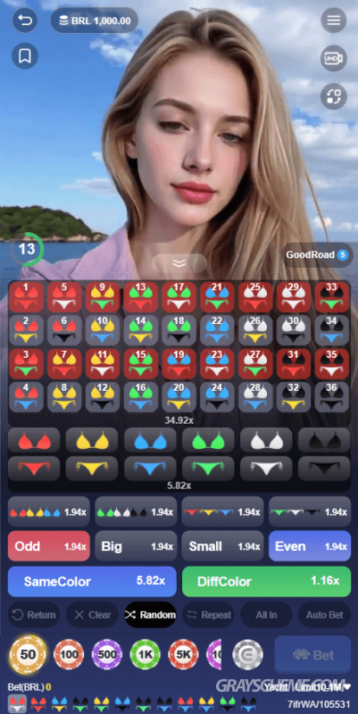 - Размещение ставки. Игрок делает прогноз, выбирая один или несколько цветов купальника, который, по его мнению, надет на девушке. Каждый цвет имеет свой коэффициент выплаты (например, x2, x3, x5).