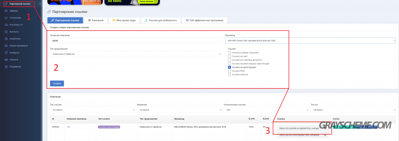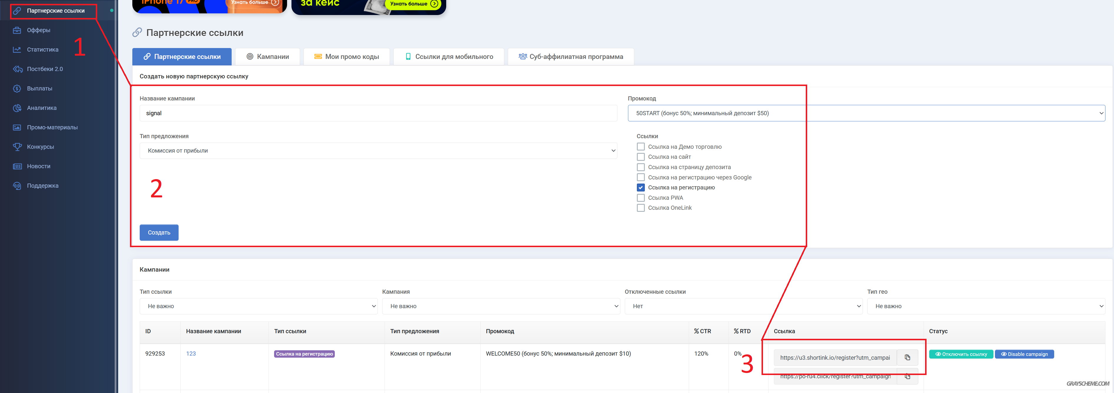 После перейдите в раздел - партнёрские ссылки и заполните поля для получения ссылки: