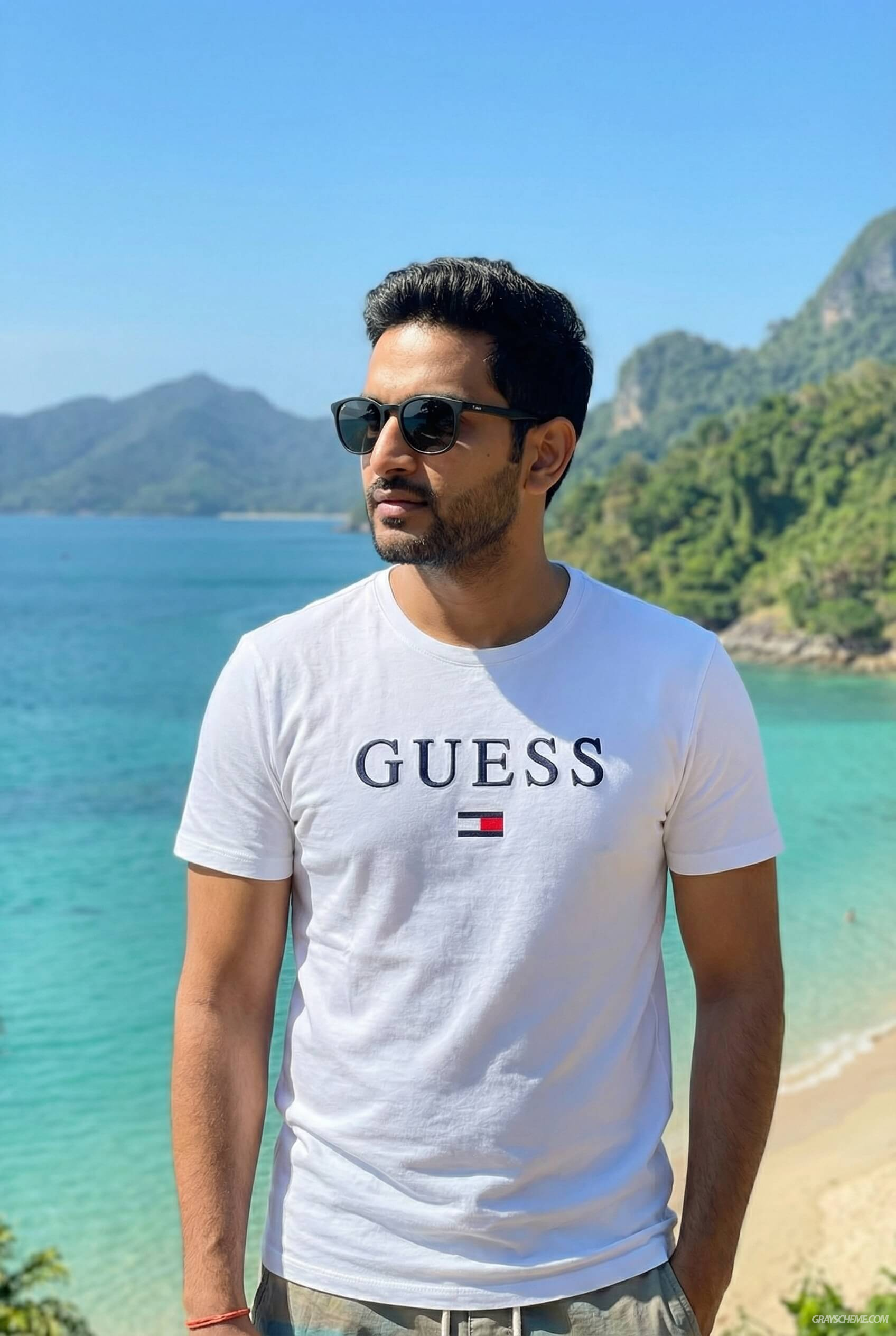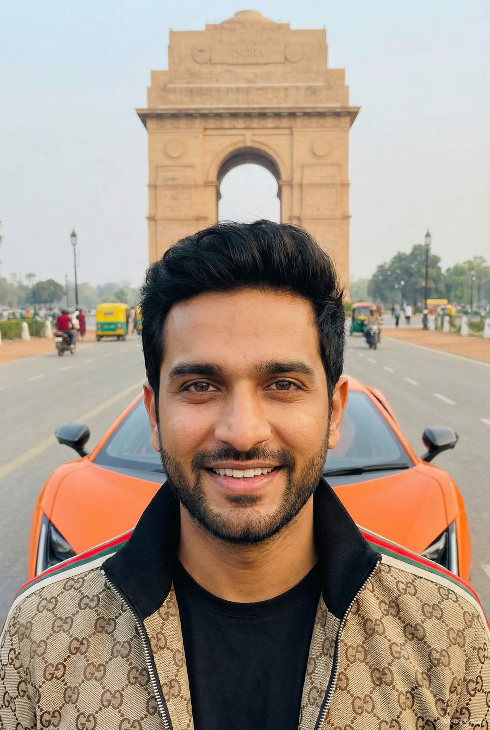 Дополнительно мы сгенерировали изображение нашего блогера вместе с известной индийской кинозвездой. Это эффективный приём: когда аудитория видит знакомое публичное лицо рядом с блогером, у неё на подсознательном уровне формируется ощущение авторитетности и высокого статуса.