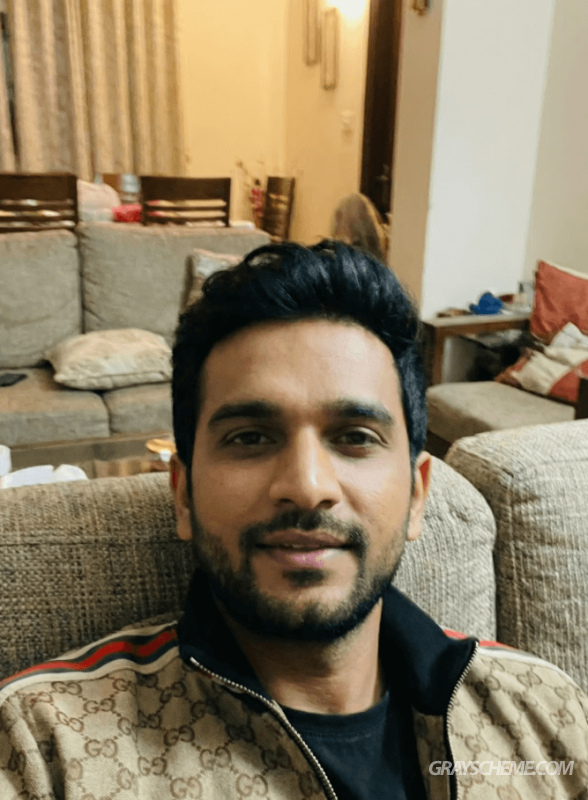 В результате мы получили фото блогера, который сидит на диване и будто снимает себя на фронтальную камеру смартфона.