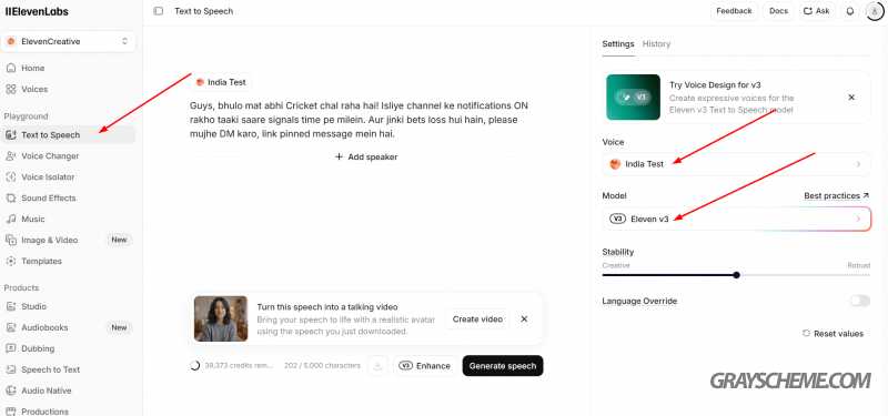 Выбираем созданного клона голоса и в параметрах модели устанавливаем Eleven V3. На данный момент это одна из лучших моделей: она обеспечивает максимальное сходство, корректно произносит окончания слов и поддерживает большое количество языков.