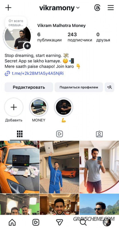 Далее оформляем приветственный пост: добавляем новое фото, короткий мотивационный текст с призывом к действию, ссылку на Instagram для повышения доверия, ссылку на казино или букмекерскую платформу, а также указываем личный аккаунт для связи.